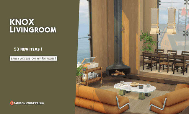 KNOX Livingroom So excited to share the KNOX Livingroom with you ! I’ve been wanting to create this fireplace for ages, and also this kind of windows! It will be perfect for your fancy high apartments in San Myshuno or even shops ! I had great times working on the shapes and textures of those items, and I hope you will like the result! 😀