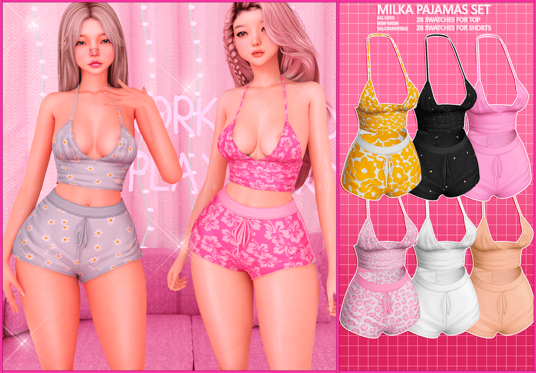 Milka pajamas set New mesh/ textures 28 swatches top 28 swatches shorts all lods Compatible with HQ mod Early access