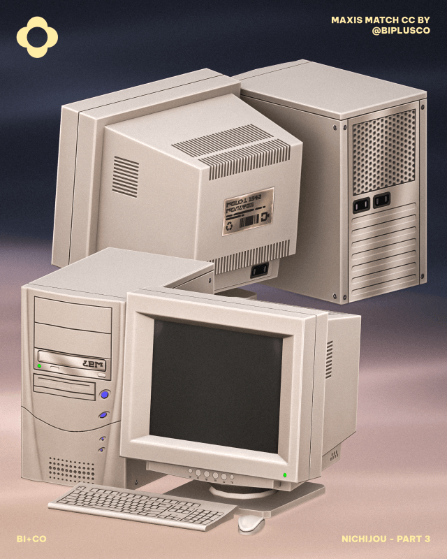 Nichijou – Part 3 Step into a time machine with the latest addition to our Nichijou collection. For Part 3, we are bringing back the hum of the 90s with this classic, chunky desktop set. We’ve crafted two distinct versions to fit any storytelling need: The Pristine Edition: A clean, “straight-out-of-the-box” look for your tech-loving Sims who miss the golden age of floppy disks. The Rusty Edition: A weathered, “found-in-a-basement” version for your students on a budget or those creating a truly lived-in, messy apartment vibe.
