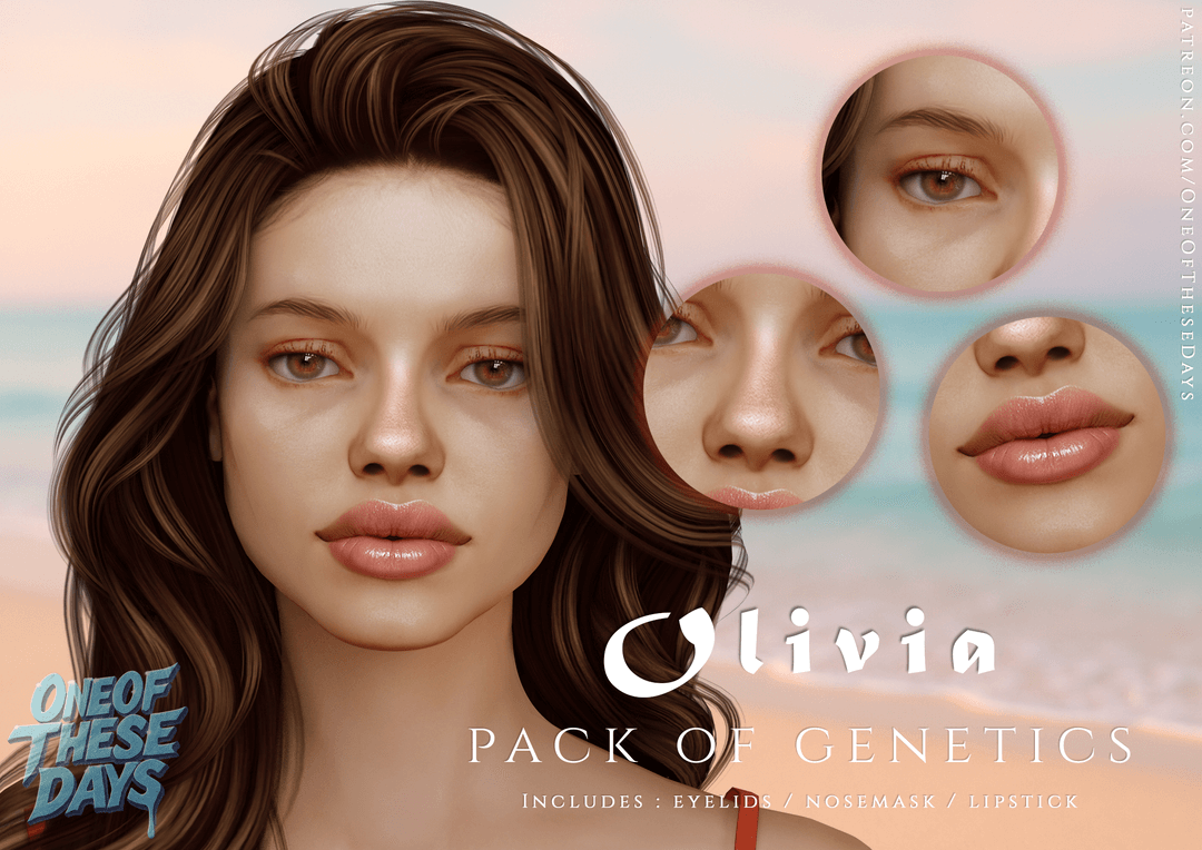 Olivia – GENETICS : EYELIDS + NOSEMASK + LIPSTICK EYELIDS06 15 swatches all ages / all genders HD texture skin details category color slider compatible NOSEMASK022 10 swatches all ages / all genders HD texture skin details category color slider compatible