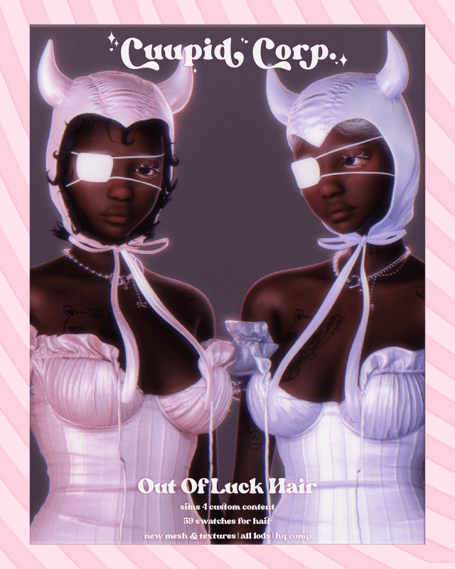 Out Of Luck Hair59 swatches for Hair w/ Hat [29k Poly] Comp w/ Dual Tones: Front, Back & Sides 22 swatches for standalone Hat [9k Poly, Found in Hats] 22 swatches for hat colors [Found in Hats, For hair w/ hat] uses Sejian’s CAS Filters (Found under Special > ☆ CUUPIDON) new mesh & textures hq comp all lods