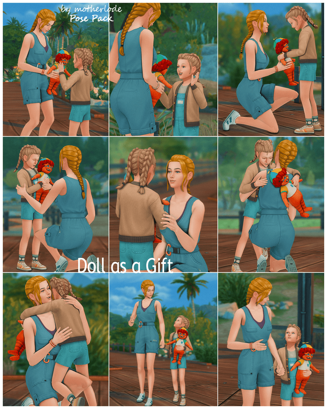 5 paired poses (adult + child) Accessories in the form of a doll (Wild Child / TKrafty Kid / Lil’ Monster / Pretty Pegacorn) are interchangeable. They are based on gameplay models from “The Sims™ 4: Adventure Awaits” expansion. The accessories are located in the hat category.