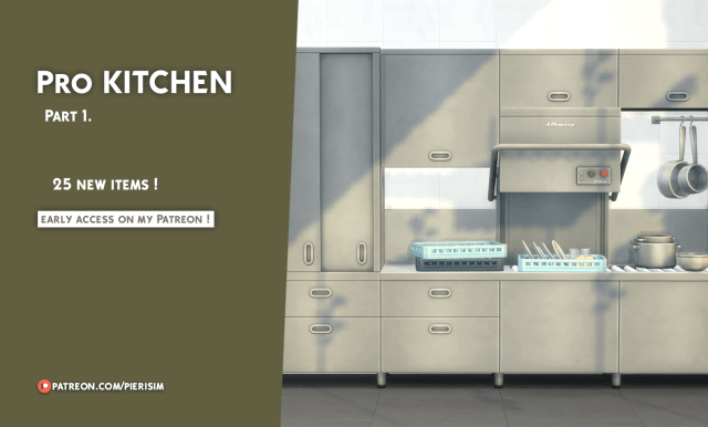 Pro KITCHEN You will find all the counters and cabinets you need to create a professional kitchen, perfect for restaurant or even more refined homes ! You will also get a decorative professional dishwasher, helping to bring realism ! This set comes late as January has been busier than excepted, I’m back at the cinema studio for a few weeks and I don’t have enough time to work a lot on cc but I can’t wait to continue on this collection. It has been a wile since I wanted to create this kitchen, so I hope you will love it too!