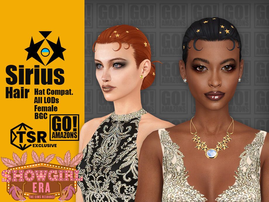 Sirius Hair (Showgirl Era) Sleek low bun hairstyle with stars accessories in maxis style.