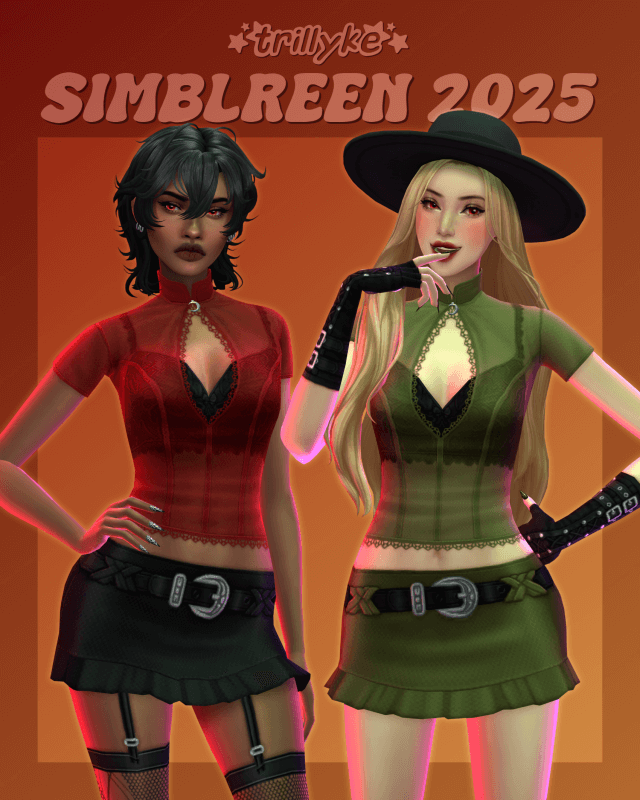 It is time to share Simblreen 2025’s treats! 🍬 My goodies this year were: a sheer top with a keyhole cutout and a lace bralette underneath, a set of stiletto nails with a spiderweb design, and a miniskirt with ruffle edge and a statement belt. 🍂 custom thumbnail top and skirt: 10 swatches / nails: 15 swatches base game compatible edited EA mesh by me